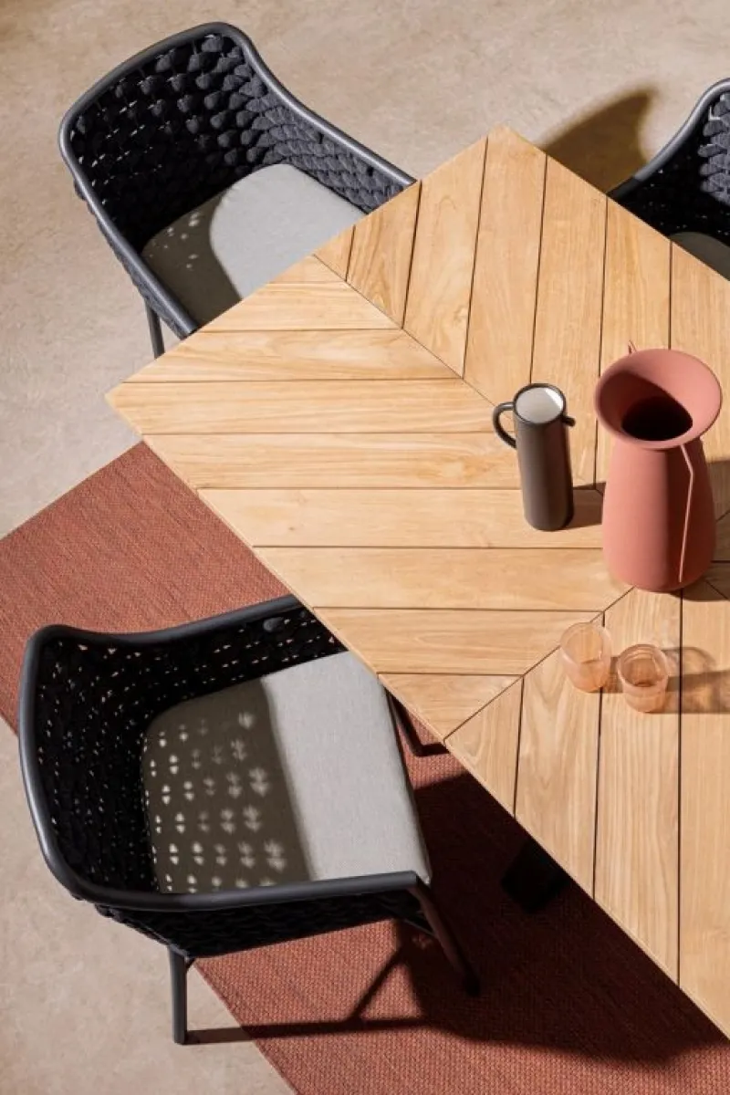 PIANO IN LEGNO TEAK (CLASSE A) – SVLK (LEGNO CERTIFICATO PROVENIENTE DA FORESTE SOSTENIBILI). GAMBE IN ALLUMINIO VERNICIATE A POLVERE (POLIESTERE). VITERIA IN ACCIAIO INOSSIDABILE. PIEDINI REGOLABILI. GAMBE DA ASSEMBLARE. ATTENZIONE CODICE IN ABBINAMENTO.