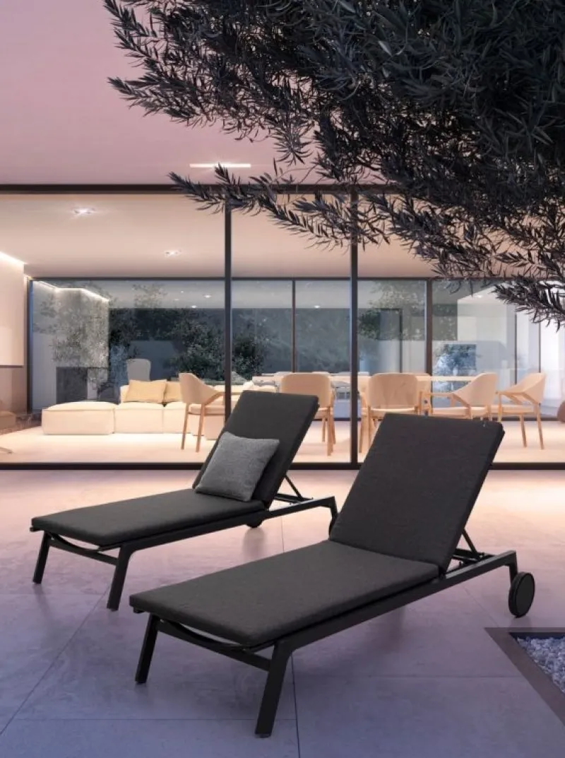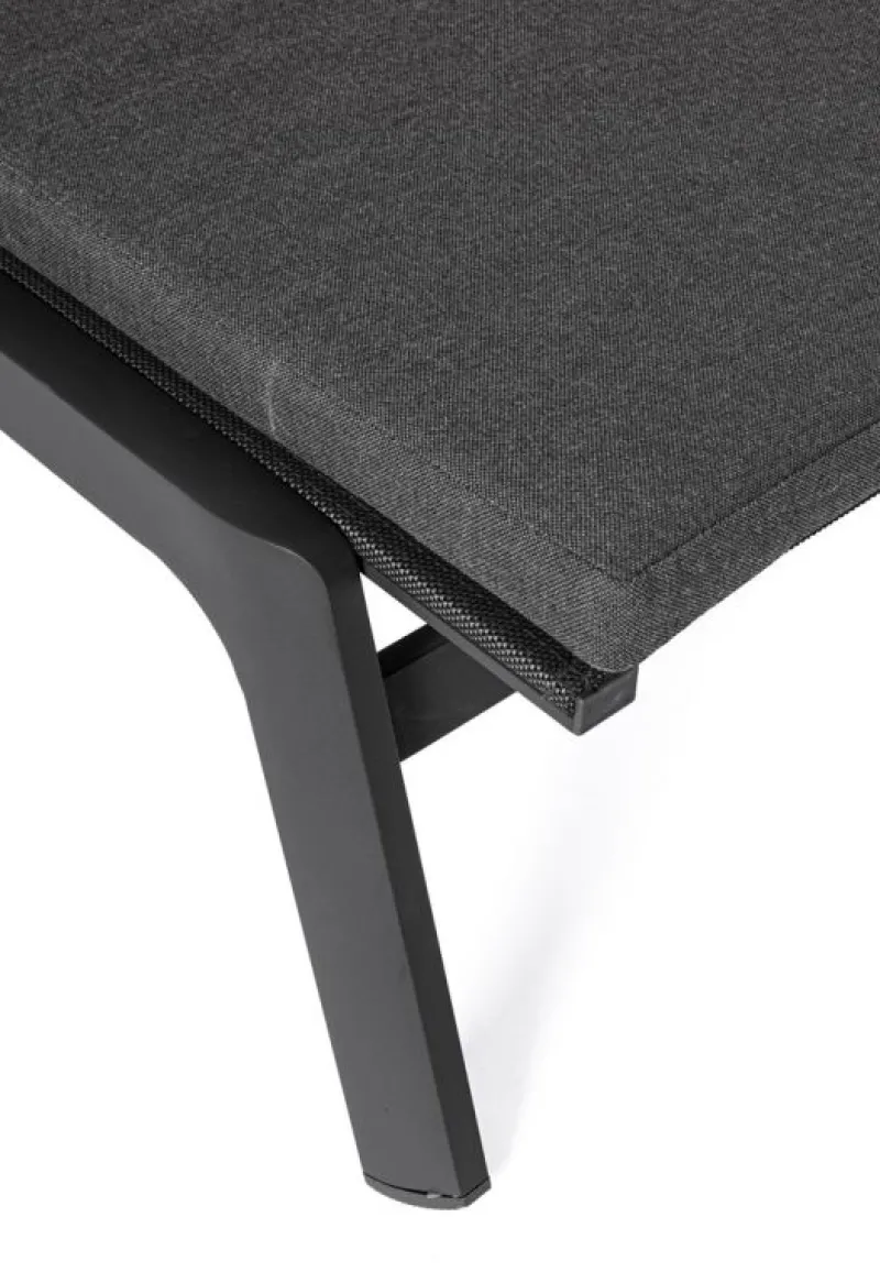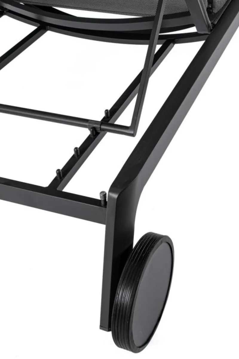 STRUTTURA IN ALLUMINIO, VERNICIATO A POLVERE (POLIESTERE). SEDUTA E SCHIENALE RIVESTITI IN TEXTILENE 2X2. CUSCINO SFODERABILE CON TESSUTO IDROREPELLENTE ACRILICO. SCHIENALE RECLINABILE (4 POSIZIONI). RUOTE IN ALLUMINIO RIVESTITE IN GOMMA.