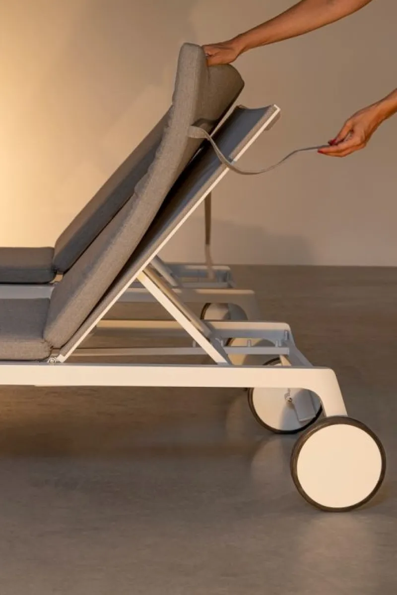 STRUTTURA IN ALLUMINIO, VERNICIATO A POLVERE (POLIESTERE). SEDUTA E SCHIENALE RIVESTITI IN TEXTILENE 2X2. CUSCINO SFODERABILE CON TESSUTO IDROREPELLENTE ACRILICO. SCHIENALE RECLINABILE (4 POSIZIONI). RUOTE IN ALLUMINIO RIVESTITE IN GOMMA.