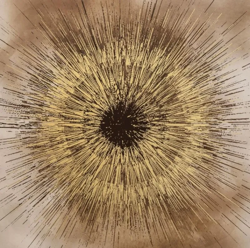 STAMPA SU TELA CON APPLICAZIONI FOGLI DORATI, LEGNO DI ABETE.