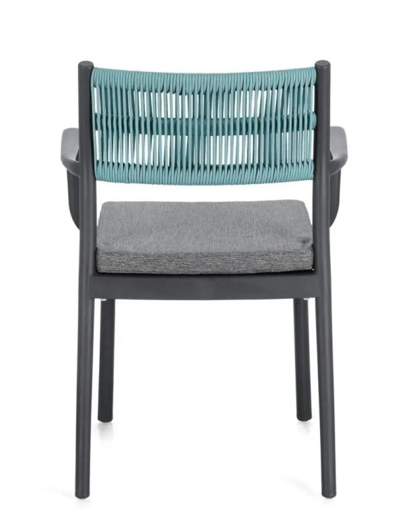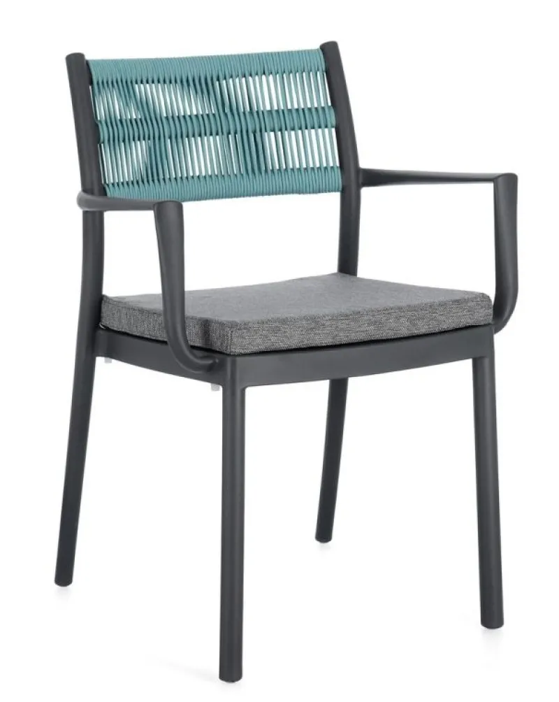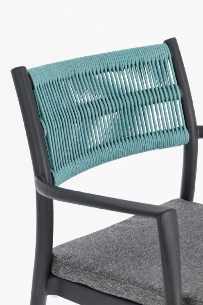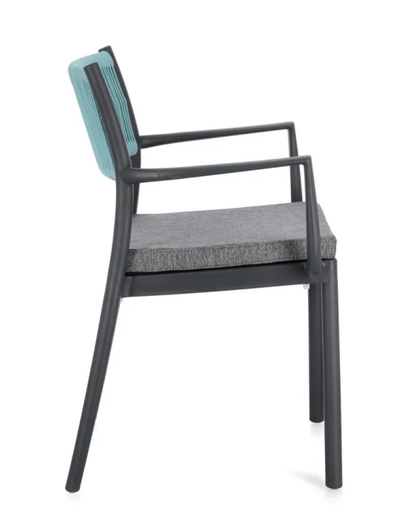 POLIPROPILENE (PP), RESISTENTE AI RAGGI UV. SCHIENALE CON INTRECCIO IN CORDA DI POLIESTERE. CUSCINO SEDUTA SFODERABILE CON TESSUTO IDROREPELLENTE POLIESTERE. IMPILABILE.